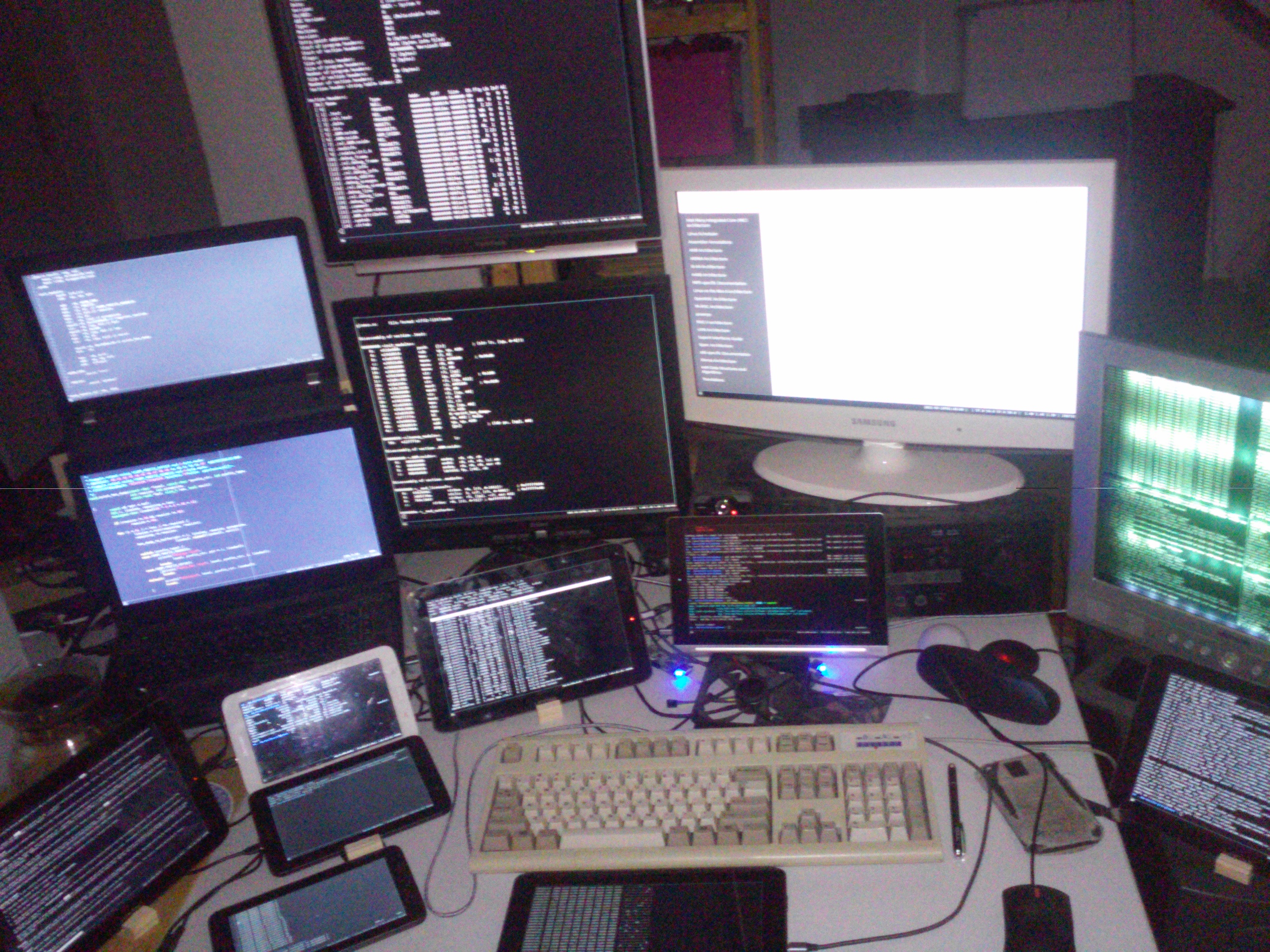 ... ok, but the laptop is left of the other three monitors, and anyway I'd not like a copy, but more space. And also, someone gave me an old monitor. Maybe I can attach this to the laptop? Oh, and here is another old laptop, I wonder... Ah yeah, and some tablets. And while I'm at it, my phone has, technically, a screen, right?